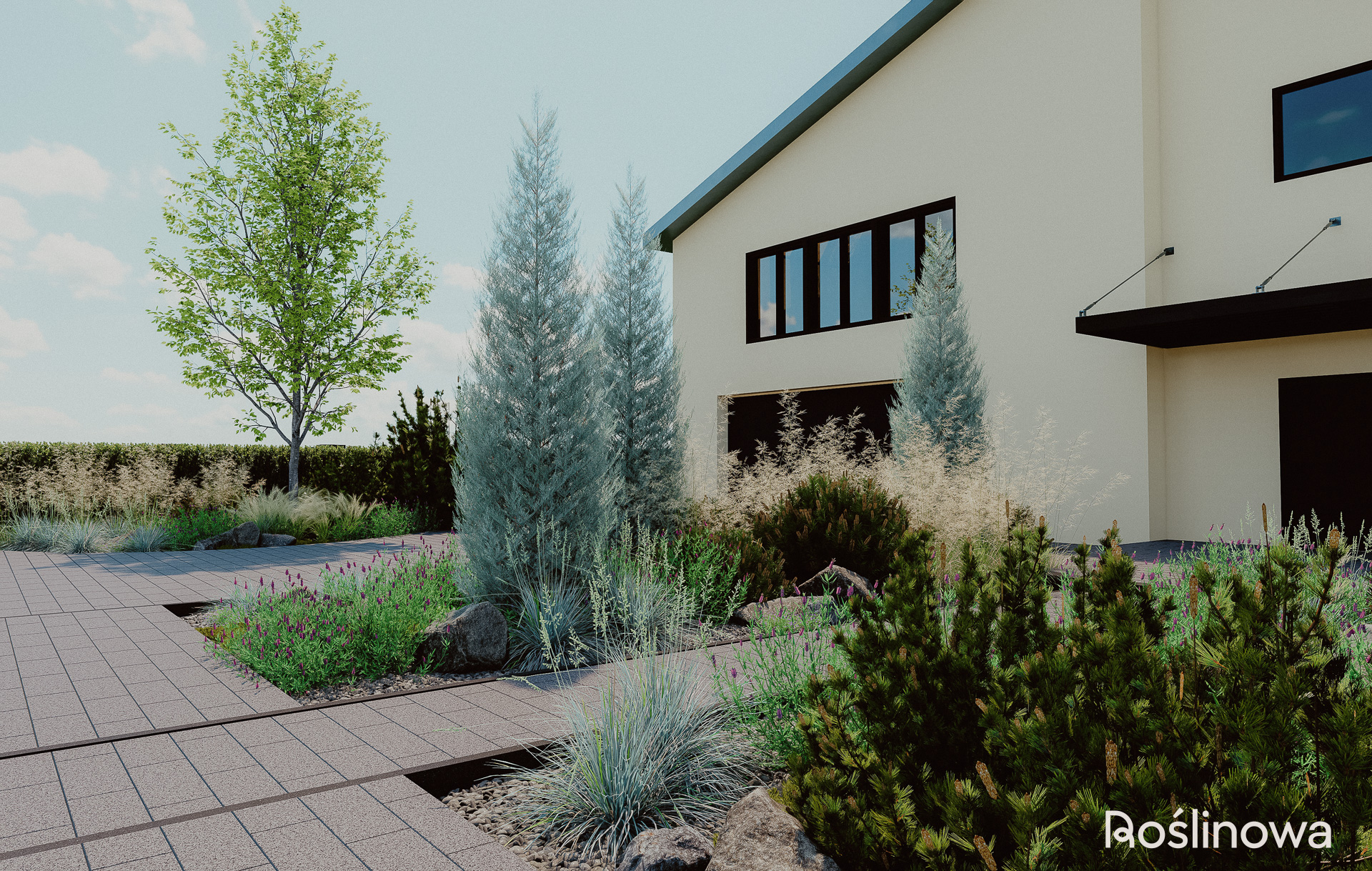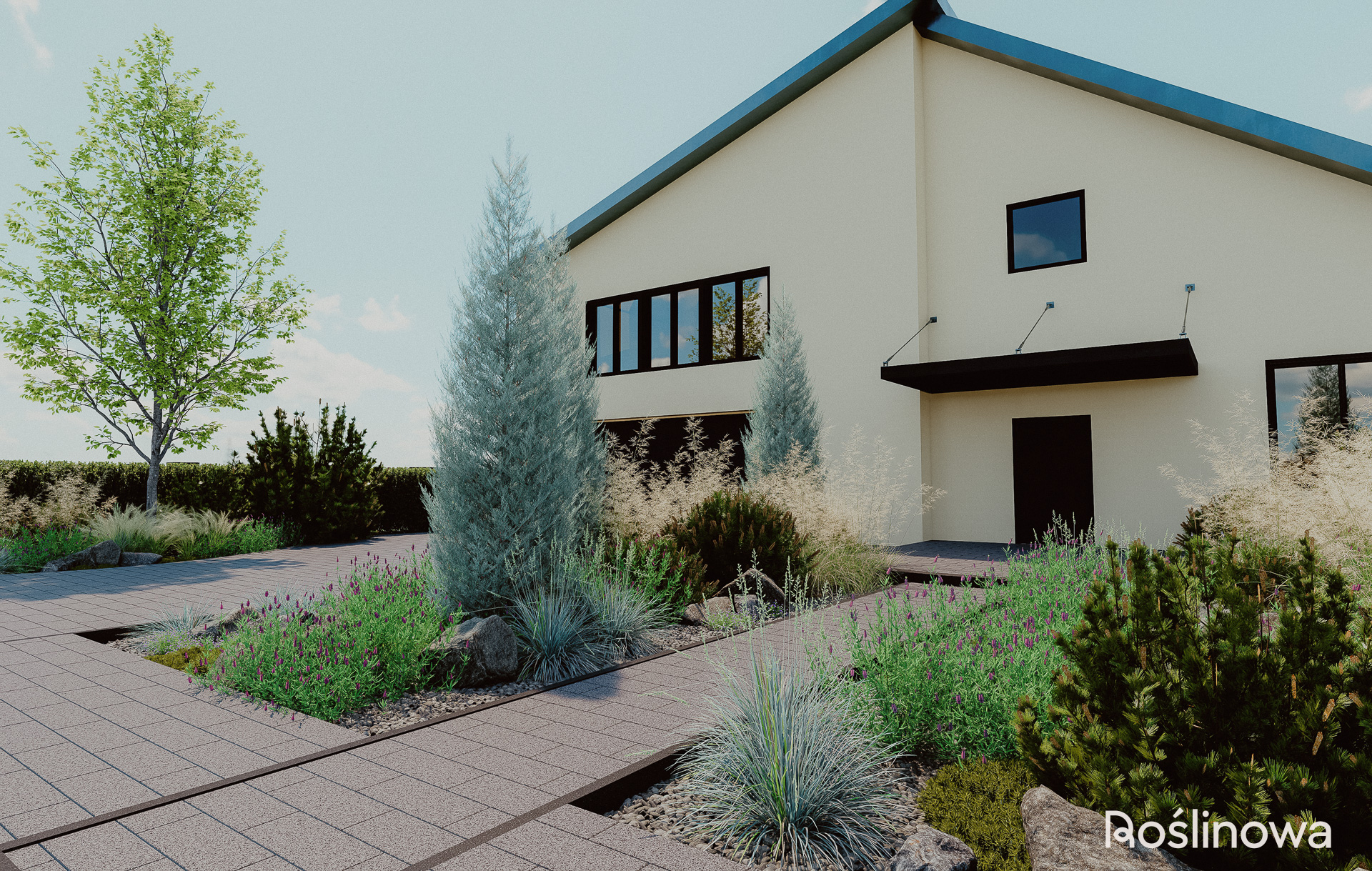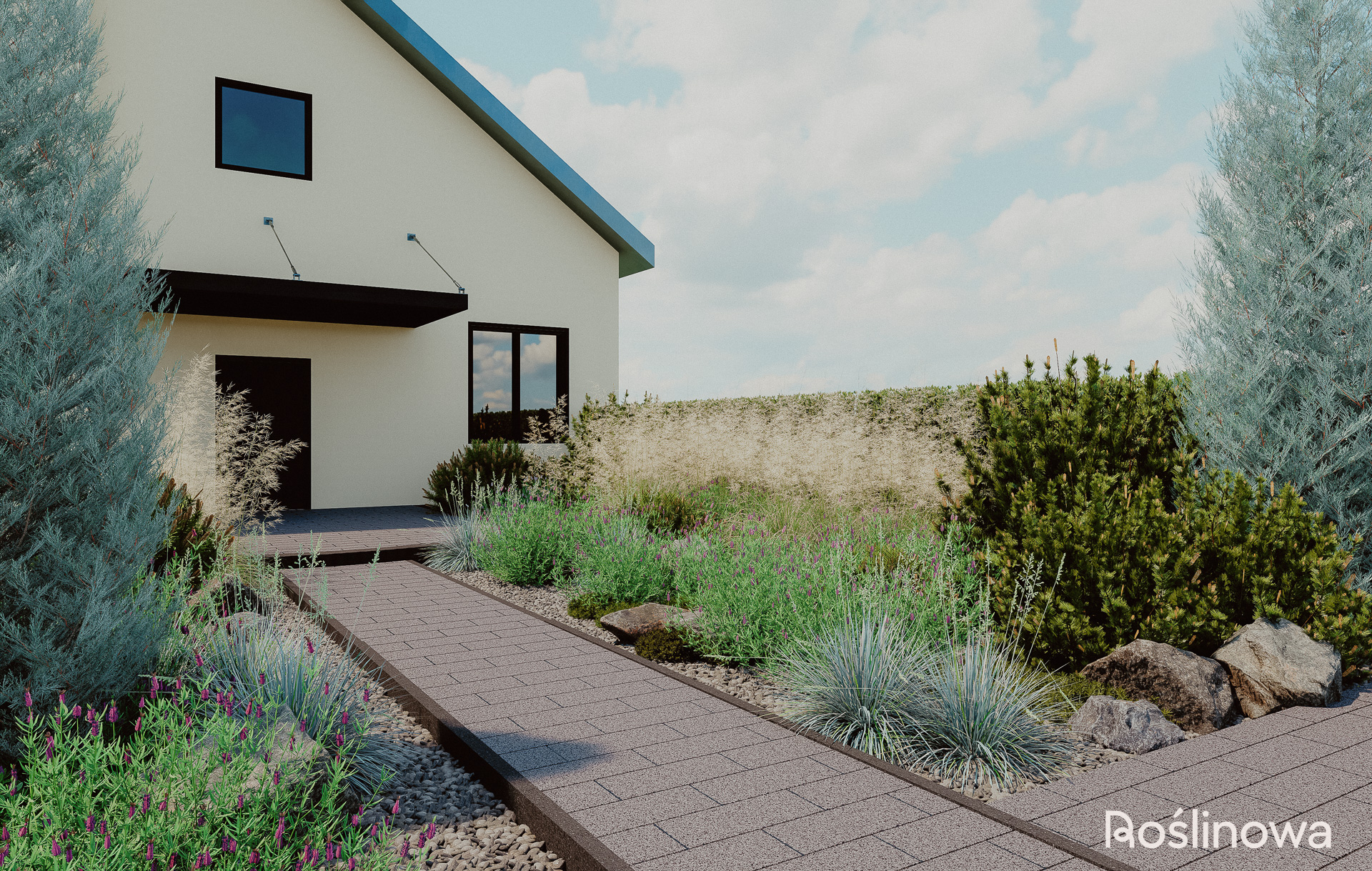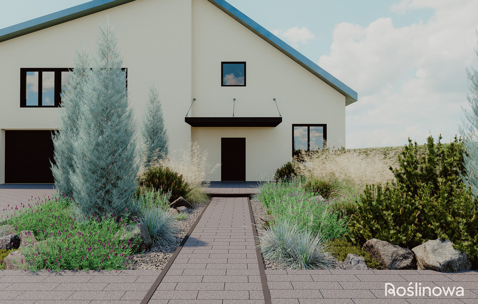 Pierwsze wrażenie buduje się już od progu. Ten projekt ogrodu powitalnego to minimalistyczna, a zarazem efektowna strefa reprezentacyjna domu. Połączenie aromatycznej lawendy z naturalnymi głazami nadaje przestrzeni lekki, skandynawski charakter. Trzy strategicznie rozmieszczone rabaty – wzdłuż ścieżki wejściowej oraz przy wjeździe do garażu – wprowadzają nowoczesny, roślinny klimat, który wita domowników i gości od samej bramy.