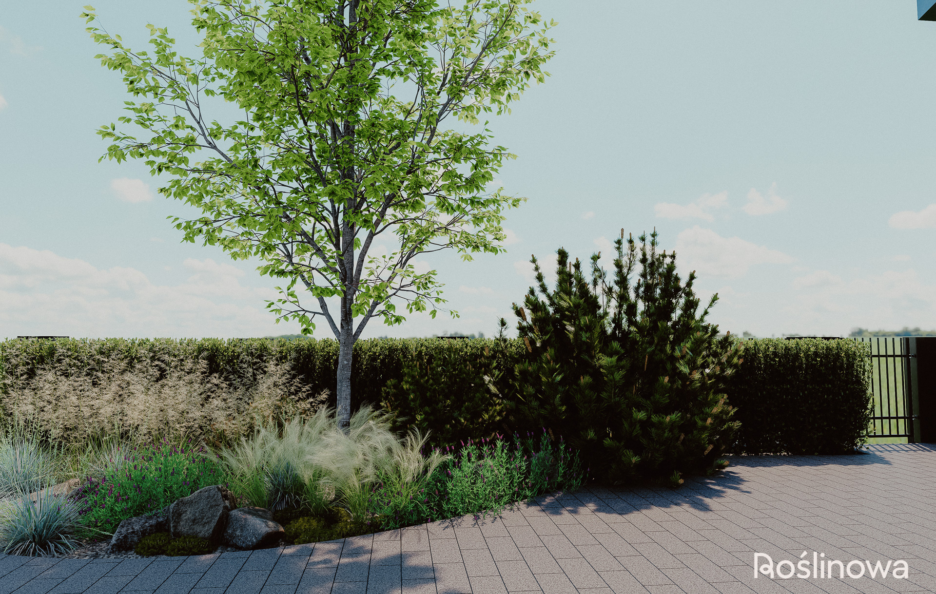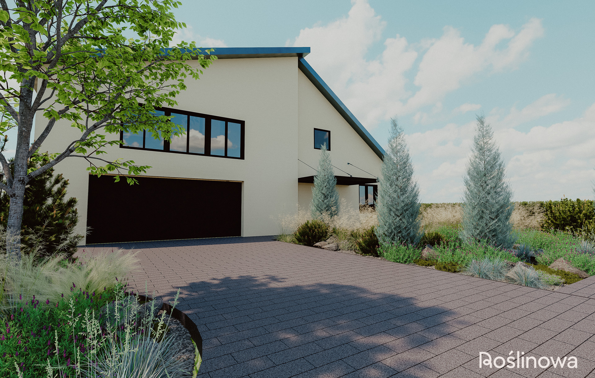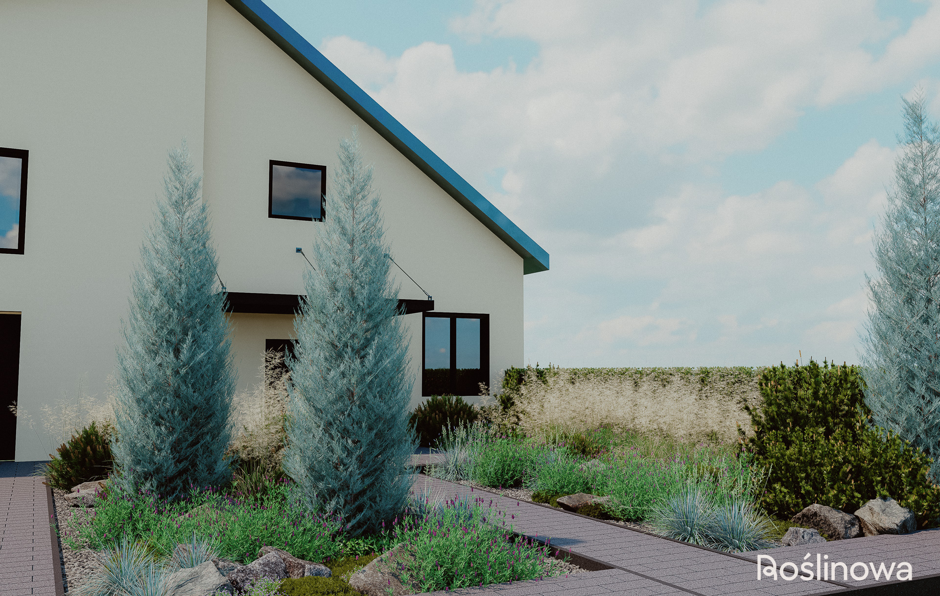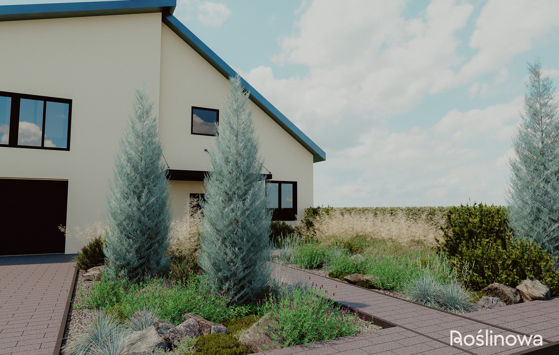 Pierwsze wrażenie buduje się już od progu. Ten projekt ogrodu powitalnego to minimalistyczna, a zarazem efektowna strefa reprezentacyjna domu. Połączenie aromatycznej lawendy z naturalnymi głazami nadaje przestrzeni lekki, skandynawski charakter. Trzy strategicznie rozmieszczone rabaty – wzdłuż ścieżki wejściowej oraz przy wjeździe do garażu – wprowadzają nowoczesny, roślinny klimat, który wita domowników i gości od samej bramy.